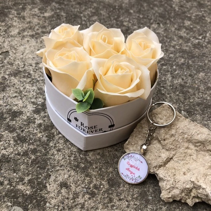 Anyák napi ajándékcsomag 016 - mini barack szív rózsabox, választható kulcstartóval