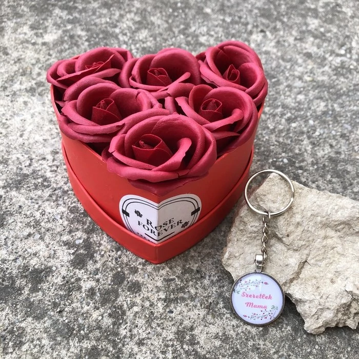 Anyák napi ajándékcsomag 069 - mini vörös szív alakú rózsabox, Szeretlek Mama kulcstartóval