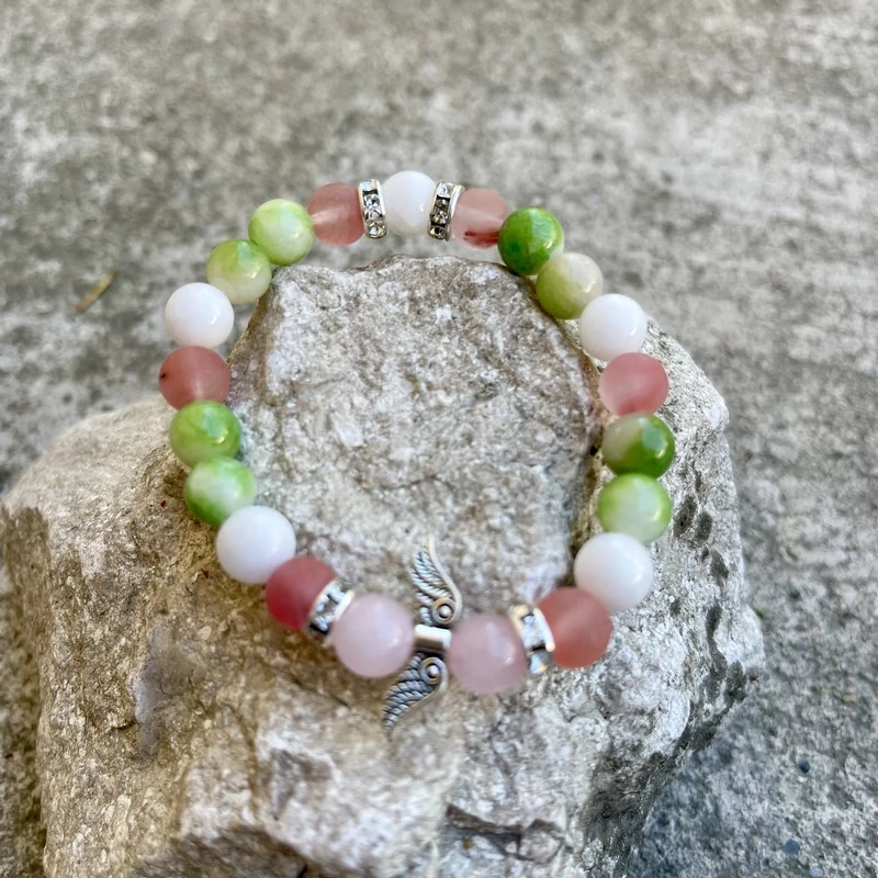 Saját készítésű ásvány karkötő 8 mm átmérőjű Rózsakvarc, Quartz és Jáde ásványok felhasználásával.