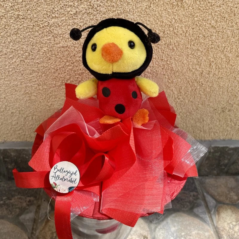 Ballagási közepes csokor, katica jelmezes csibe plüssel - piros