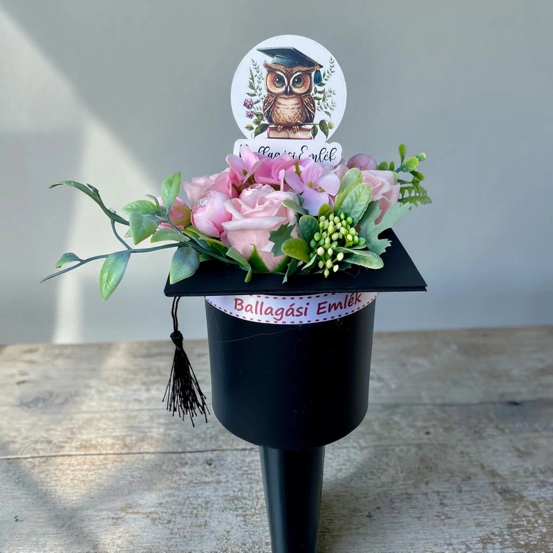 Ballagási rózsabox csokor, ballagási kalapban, szárral, rózsaszín virágokkal, baglyos ballagási táblával