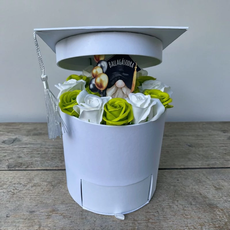 Fehér ballagási kalap, zöld-fehér szappanrózsákkal, fiókkal, ajándék táblával