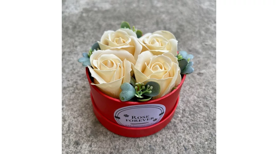 Barack szappanrózsák, kör alapú, piros rózsaboxban
