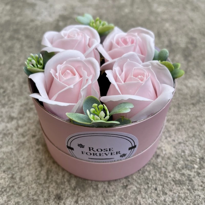 Halvány rózsaszín szappanrózsák, kör alapú, rózsaszín rózsaboxban