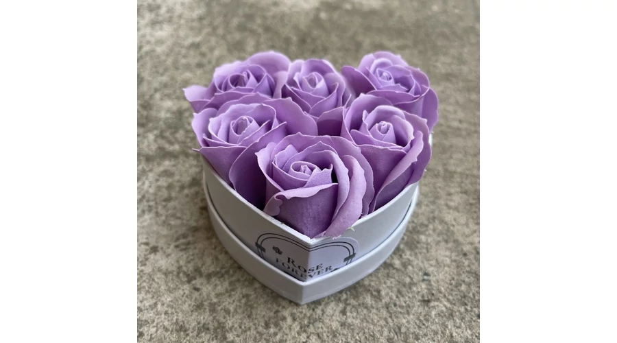 Halvány lila szappanrózsák, szív alakú, fehér rózsaboxban