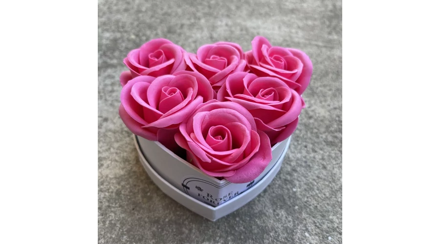 Sötét pink szappanrózsák, szív alakú, fehér rózsaboxban