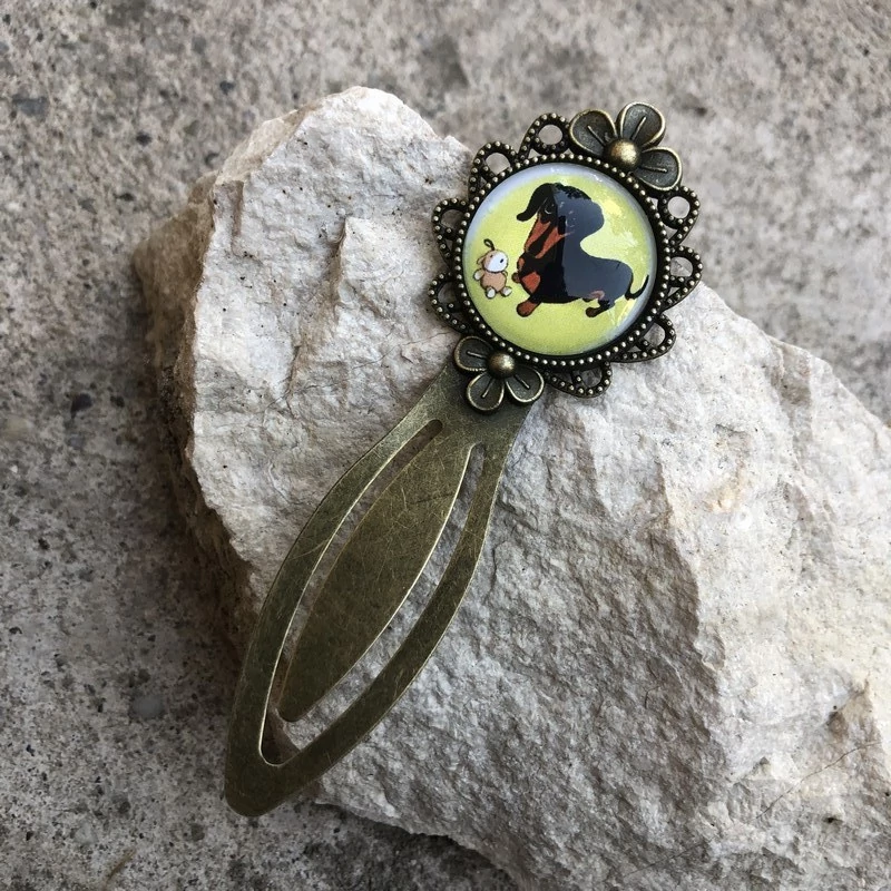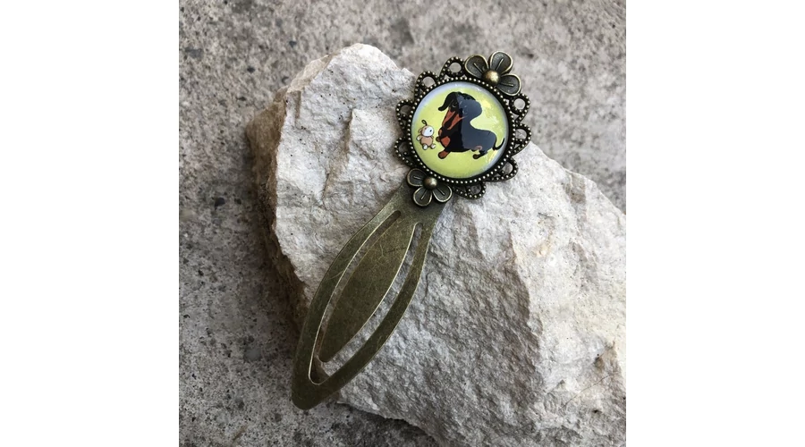 Fémötvözetből készült üveglencsés, csíptetős könyvjelző, egyedi készítésű, kézműves ajándéktárgy.