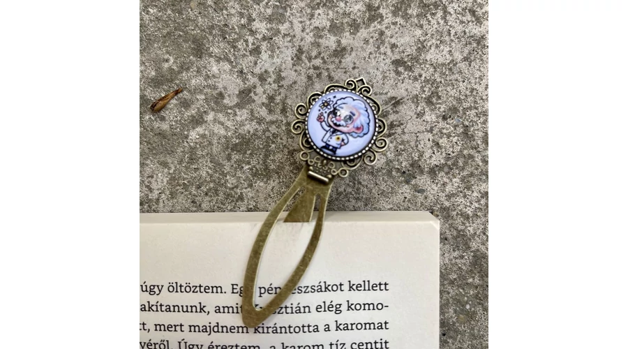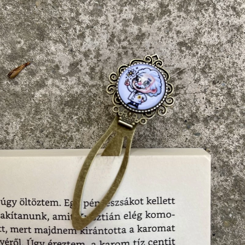 Fémötvözetből készült üveglencsés, csíptetős könyvjelző, egyedi készítésű, kézműves ajándéktárgy.