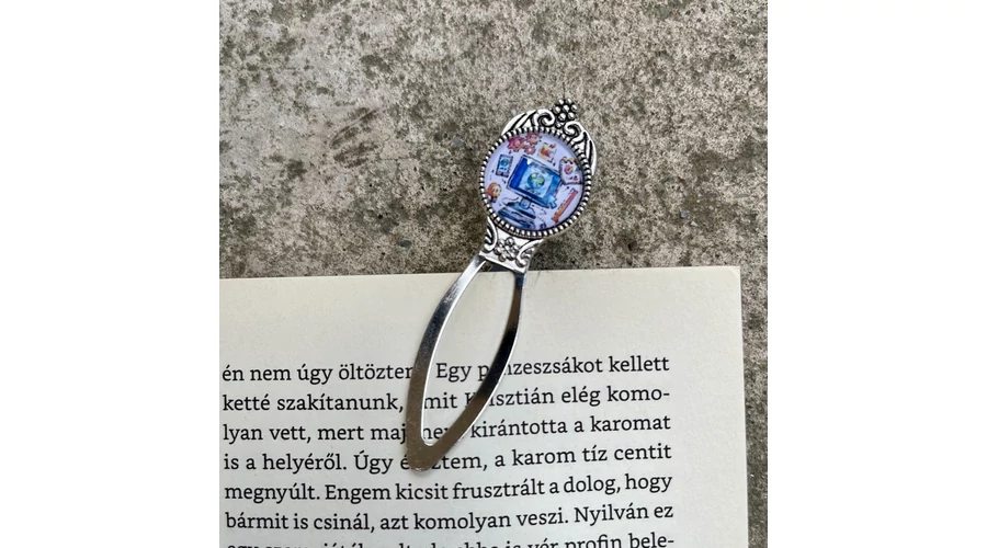 Fémötvözetből készült üveglencsés, csíptetős könyvjelző, egyedi készítésű, kézműves ajándéktárgy.
