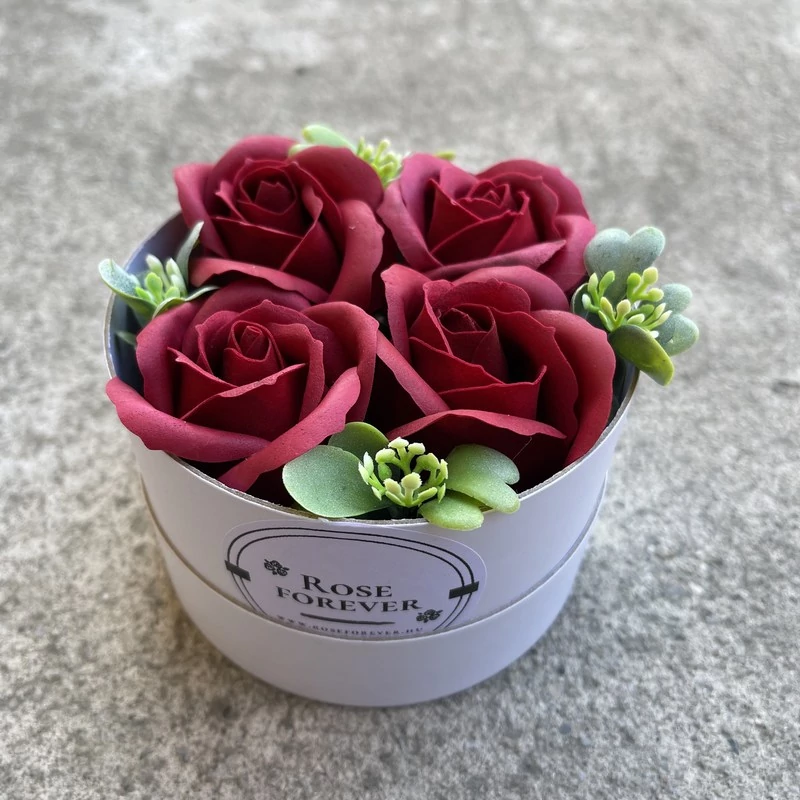Bordó szappanrózsák, kör alapú, fehér rózsaboxban