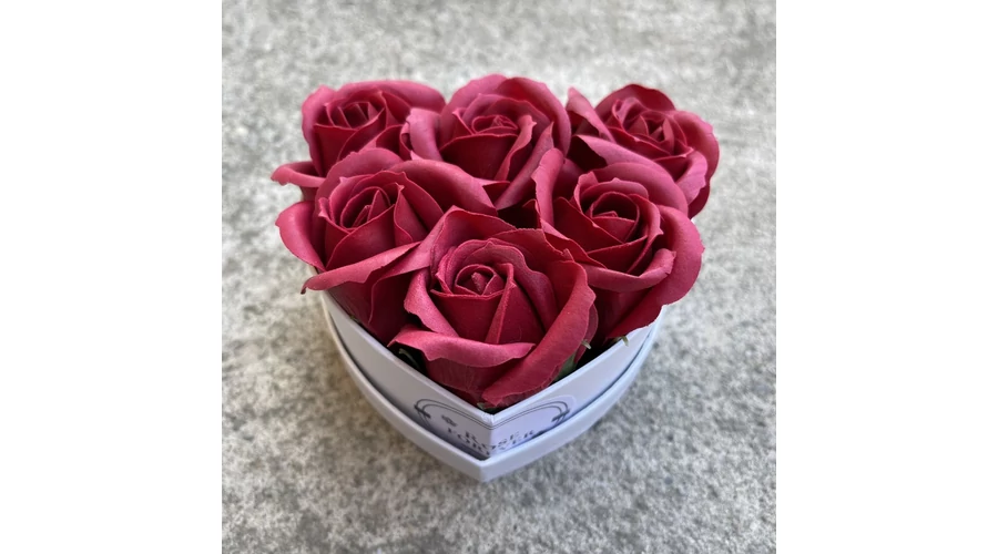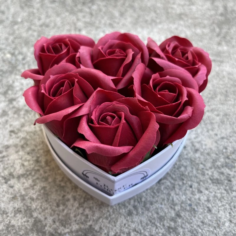 Bordó szappanrózsák, szív alakú, fehér rózsaboxban