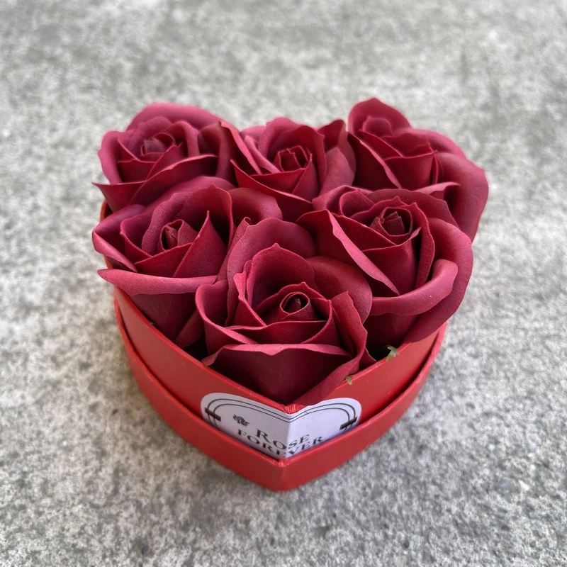 Bordó szappanrózsák, szív alakú, piros rózsaboxban