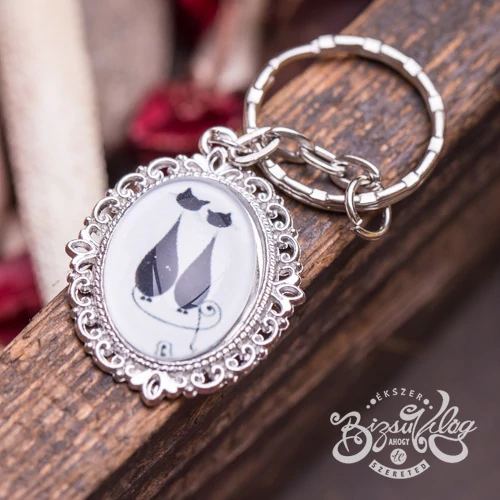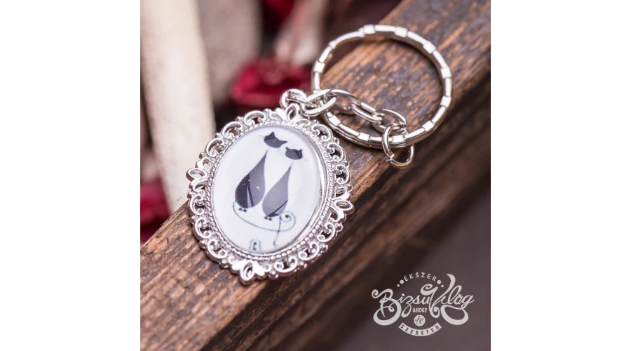 Fémötvözetből, üveglencsés technikával készült, egyedi készítésű kulcstartó.