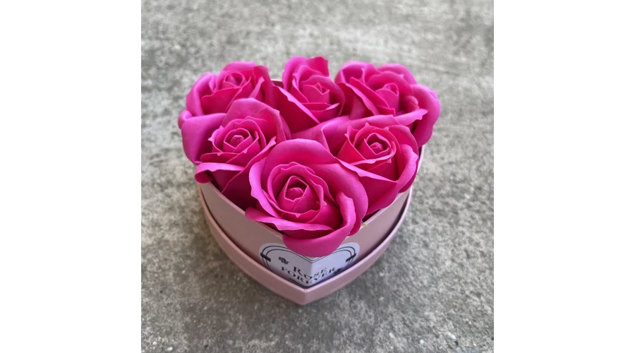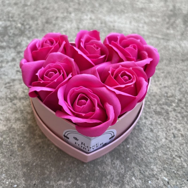 Ciklámen szappanrózsák, szív alakú, rózsaszín rózsaboxban