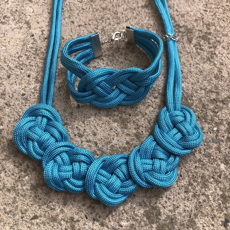 Egyedi, paracord zsinórból készült csomózott nyakláncból és csomózott karkötőből álló ékszer szett.