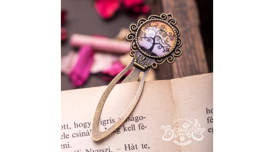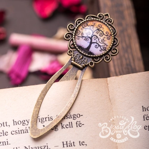 Fémötvözetből készült üveglencsés, csíptetős könyvjelző, egyedi készítésű, kézműves ajándéktárgy.
