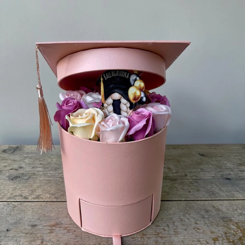 Rózsaszín ballagási kalap, vegyes rózsaszín szappanrózsákkal, fiókkal, ajándék táblával