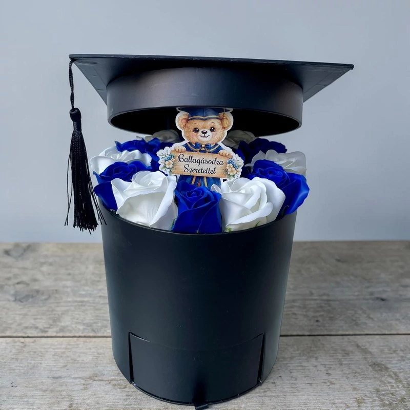 Fekete ballagási kalap, kék-fehér szappanrózsákkal, fiókkal, ajándék táblával