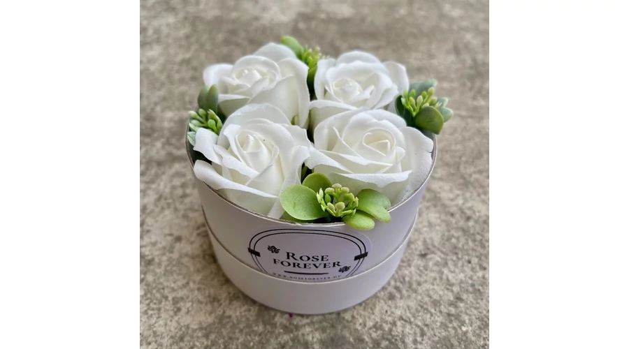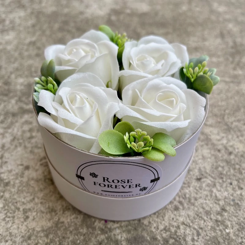 Fehér szappanrózsák, kör alapú, fehér rózsaboxban