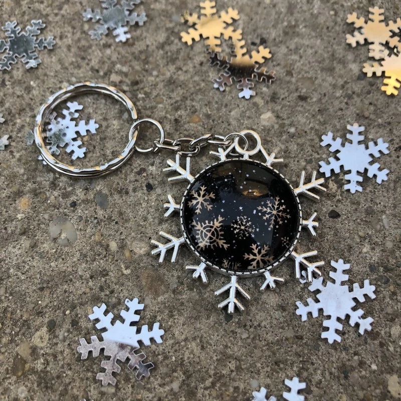 Fémötvözetből készült üveglencsés, karácsonyi kulcstartó, egyedi készítésű, kézműves ajándéktárgy, tökéletes karácsonyi ajándék.