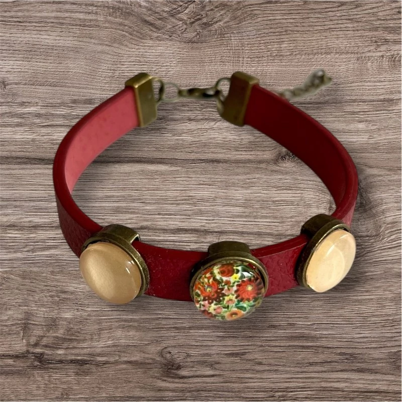 Üveglencsés technikával készült, egyedi készítésű bizsu karkötő, bőrszíj alapon.