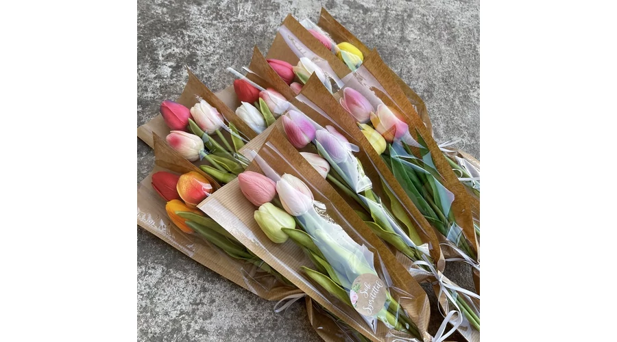 FONTOS! A csomag tartalma: 2 csokor 3 szálas gumitulipán csokor díszcsomagolásban, Sok szeretettel matricával ellátva, a színek a képen lévőkből kerülnek ki, 2 db RANDOM általam választott csokor kerül postázásra!!!