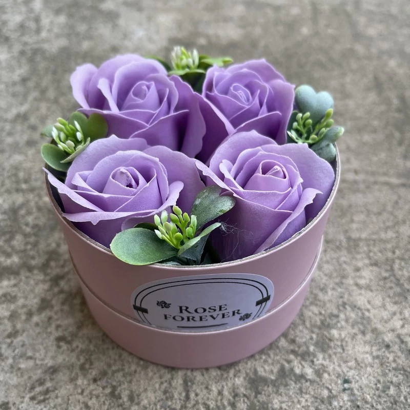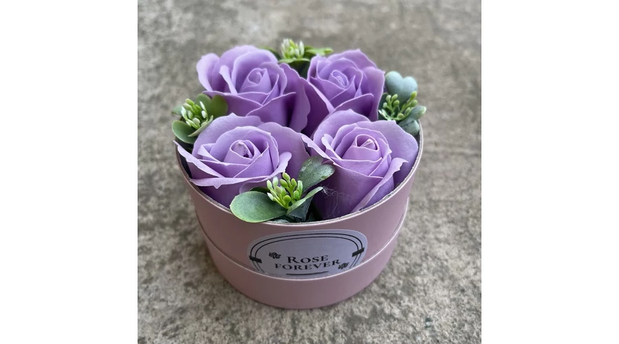 Halvány lila szappanrózsák, kör alapú, rózsaszín rózsaboxban