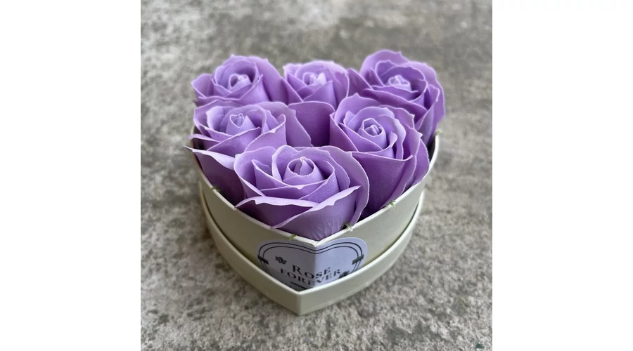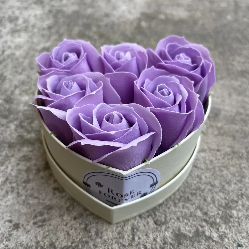 Halvány lila szappanrózsák, szív alakú, krém rózsaboxban