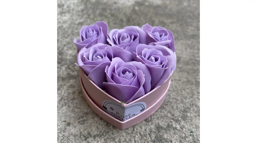Halvány lila szappanrózsák, szív alakú, rózsaszín rózsaboxban