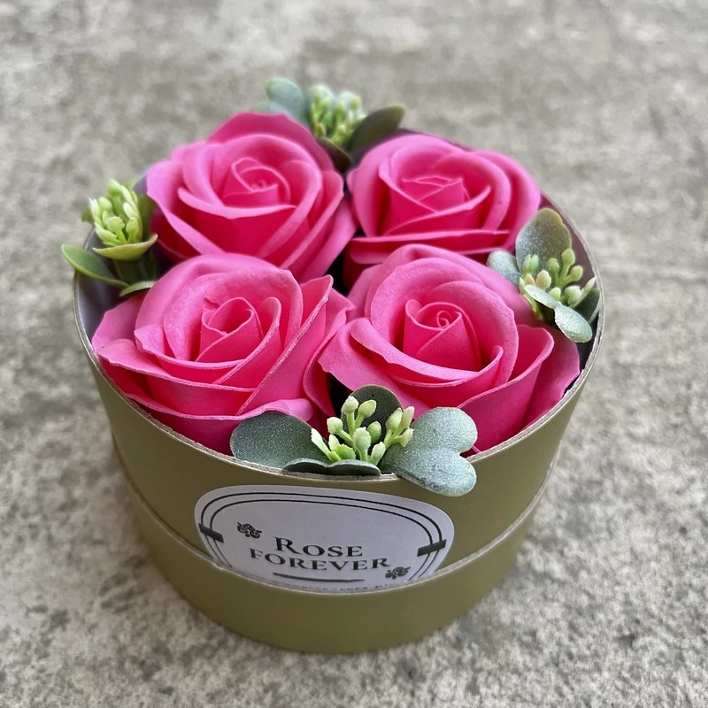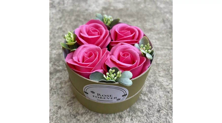 Sötét pink szappanrózsák, kör alapú, olívazöld rózsaboxban
