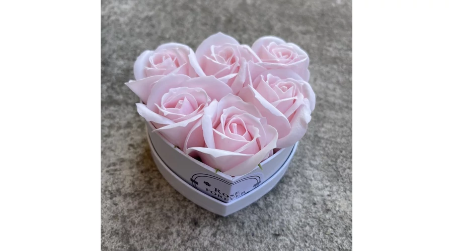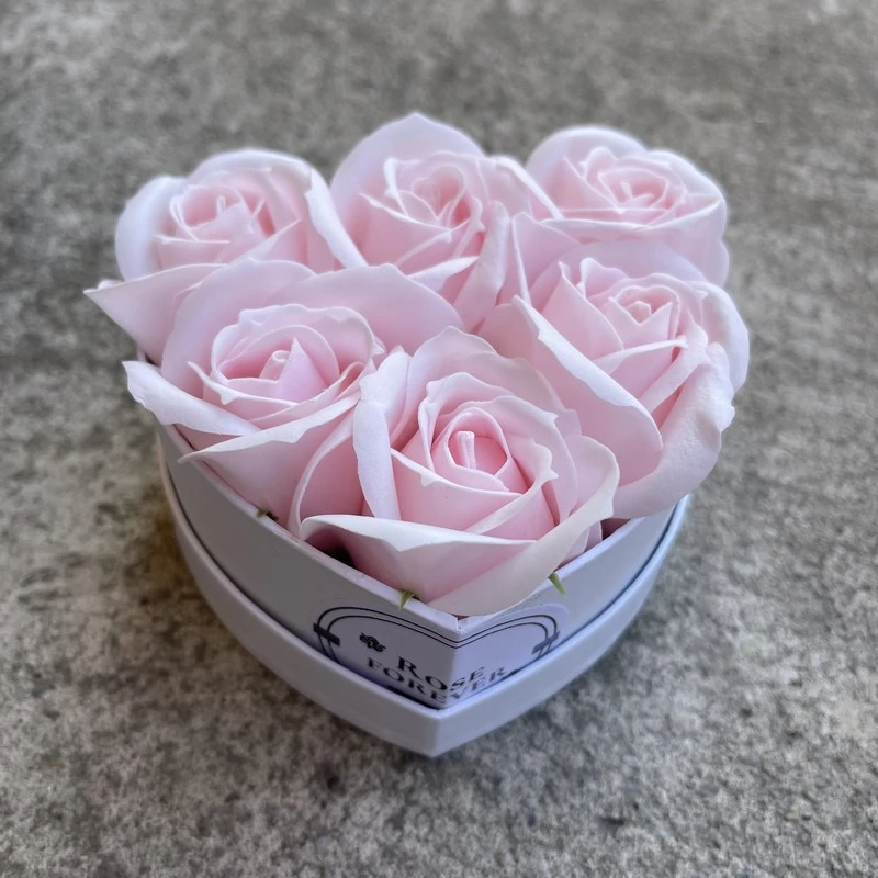 Halvány rózsaszín szappanrózsák, szív alakú, fehér rózsaboxban