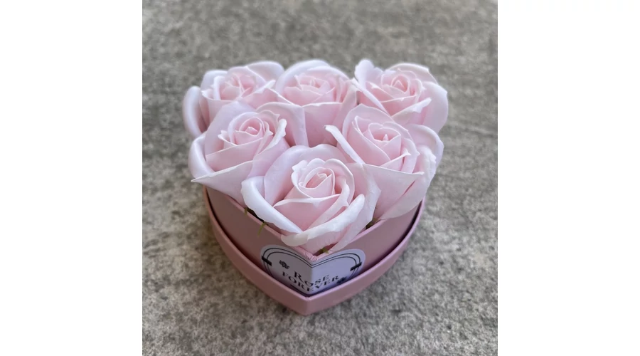 Halvány rózsaszín szappanrózsák, szív alakú, rózsaszín rózsaboxban