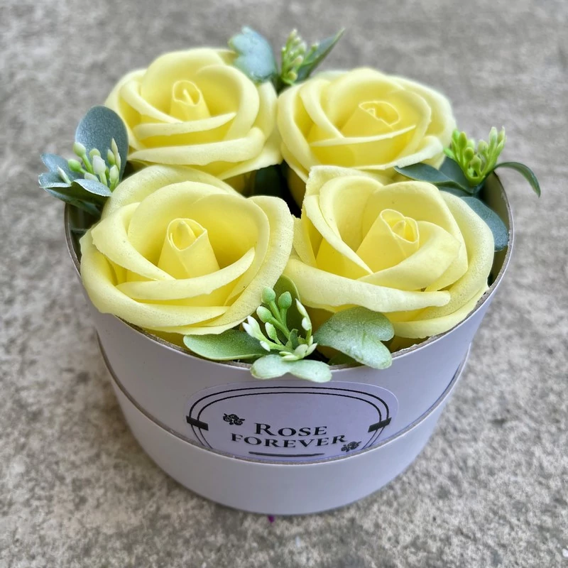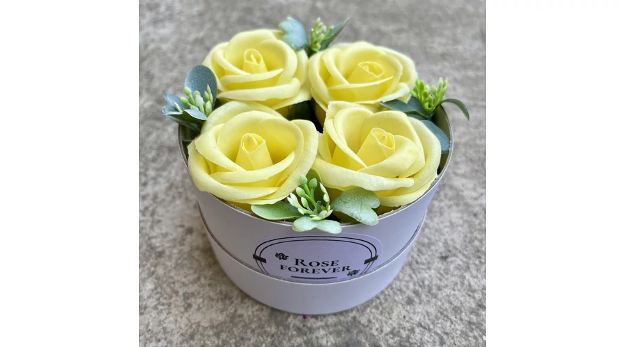 Halvány sárga szappanrózsák, kör alapú, fehér rózsaboxban