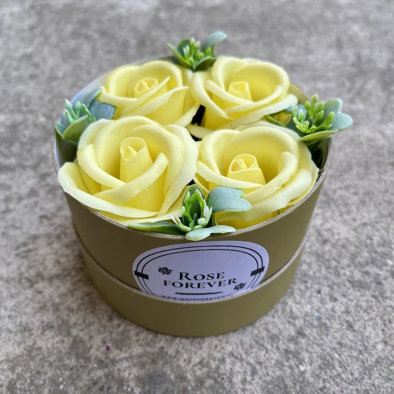 Halvány sárga szappanrózsák, kör alapú, olívazöld rózsaboxban