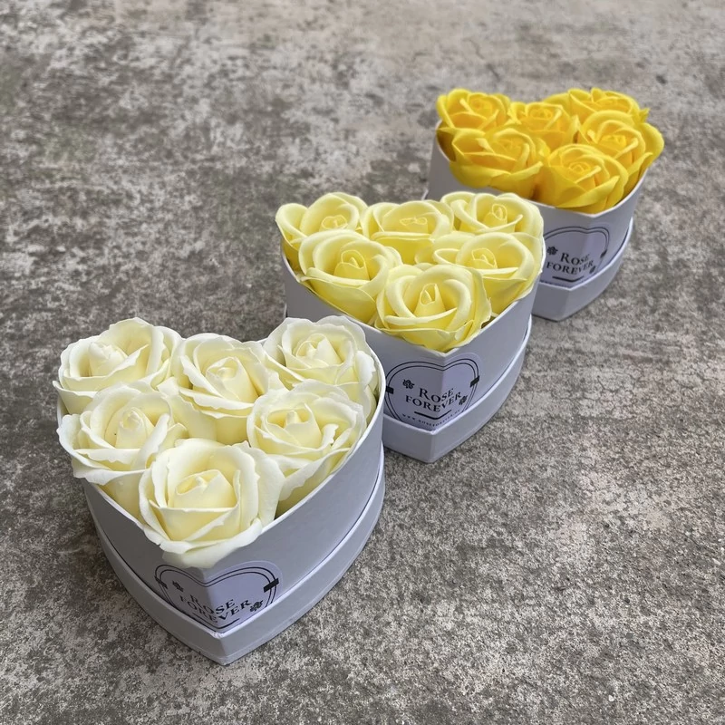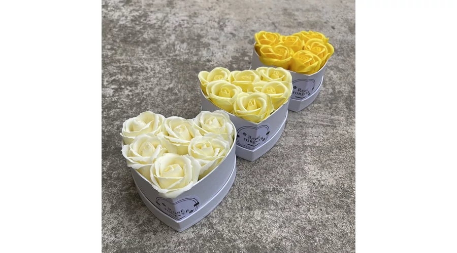 Hármas csomagajánlat - 3 db sárga rózsabox, fehér, szív alakú, dobozban