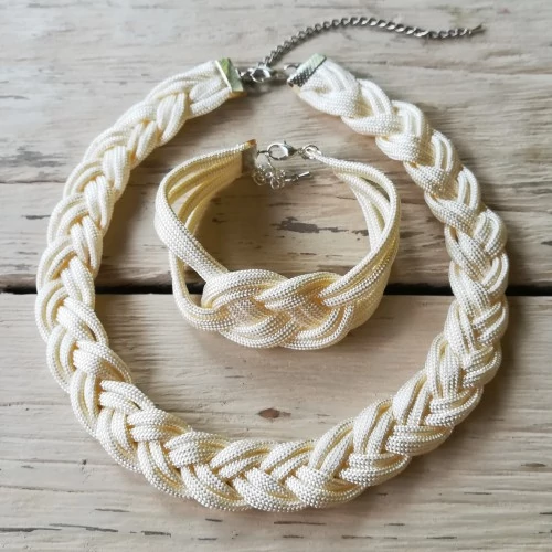 Egyedi, paracord zsinórból készült fonott nyakláncból és csomózott karkötőből álló ékszer szett.