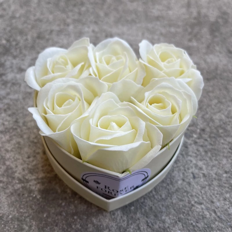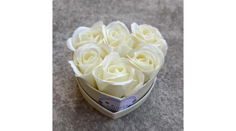 Krémszínű szappanrózsák, szív alakú, krémszínű rózsaboxban