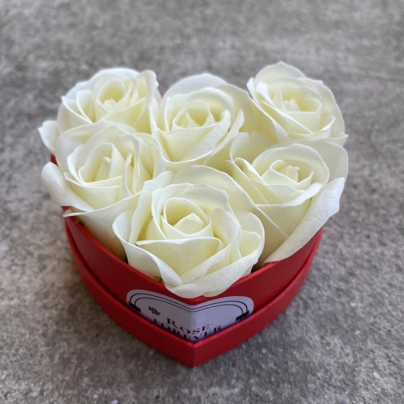 Krémszínű szappanrózsák, szív alakú, piros rózsaboxban
