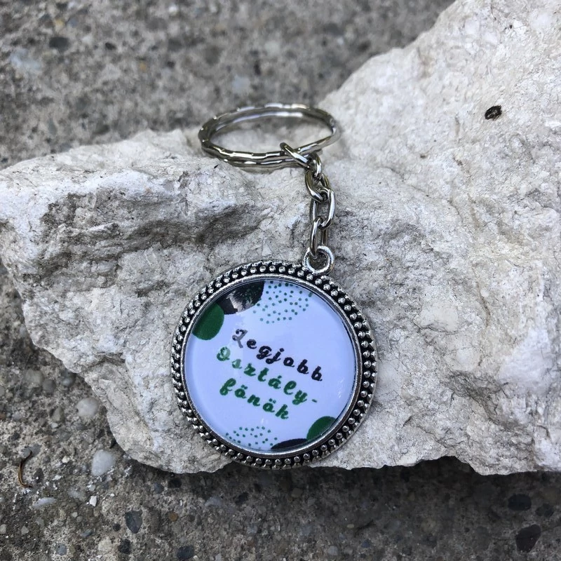 Fémötvözetből, üveglencsés technikával készült, egyedi készítésű kulcstartó.
