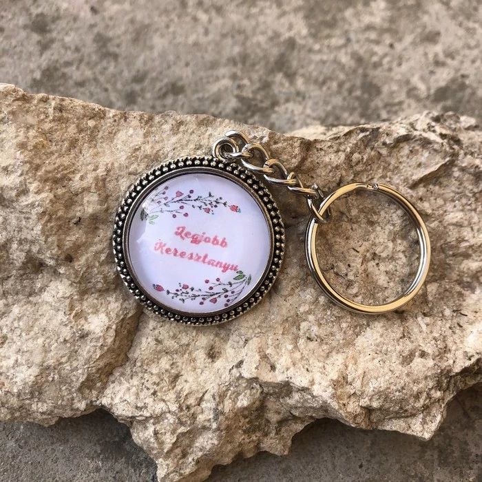 Fémötvözetből készült üveglencsés, kézműves kulcstartó, egyedi készítésű, kézműves ajándéktárgy, tökéletes ajándék Anyák napjára.