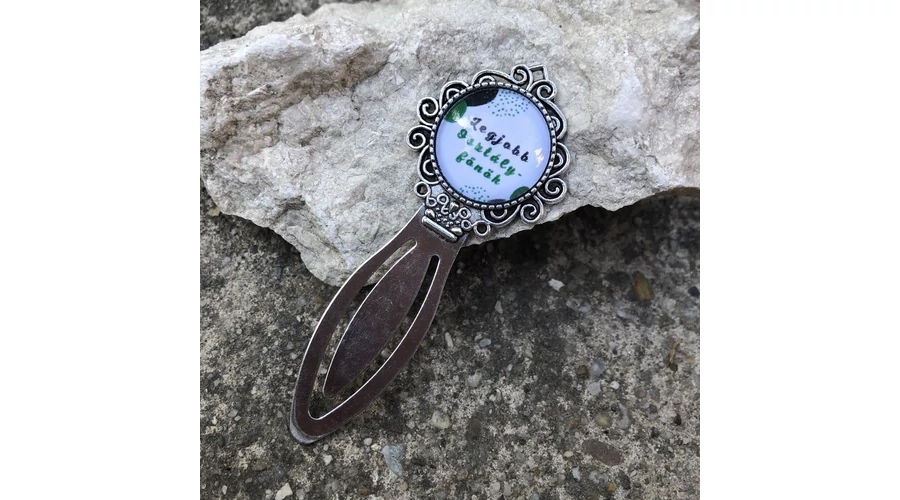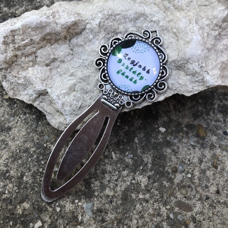 Fémötvözetből készült üveglencsés, csíptetős könyvjelző, egyedi készítésű, kézműves ajándéktárgy.