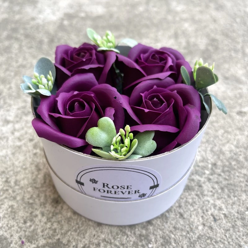 Lila szappanrózsák, kör alapú, fehér rózsaboxban
