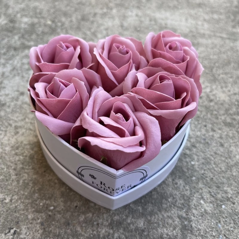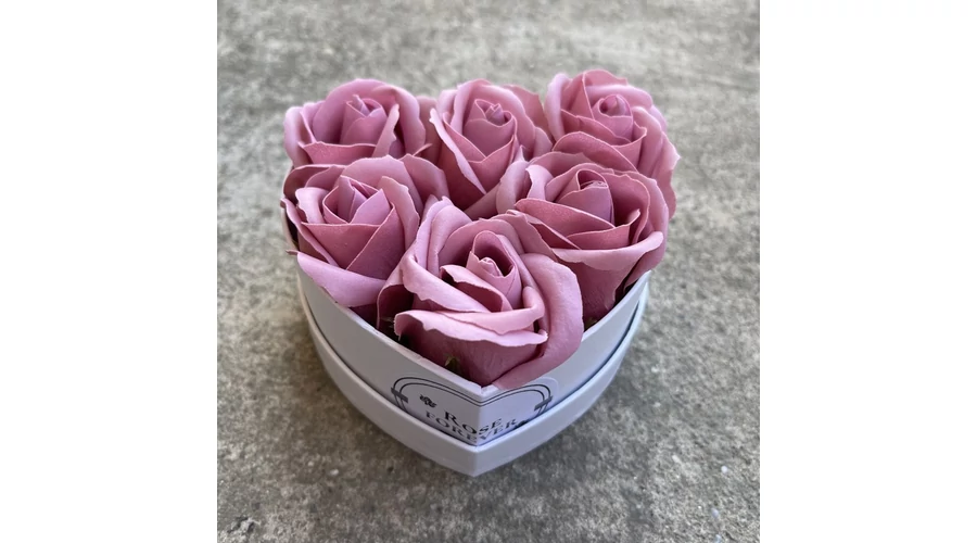 Mályva szappanrózsák, szív alakú, fehér rózsaboxban