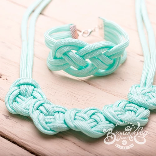 Egyedi, paracord zsinórból készült csomózott nyakláncból és csomózott karkötőből álló ékszer szett.