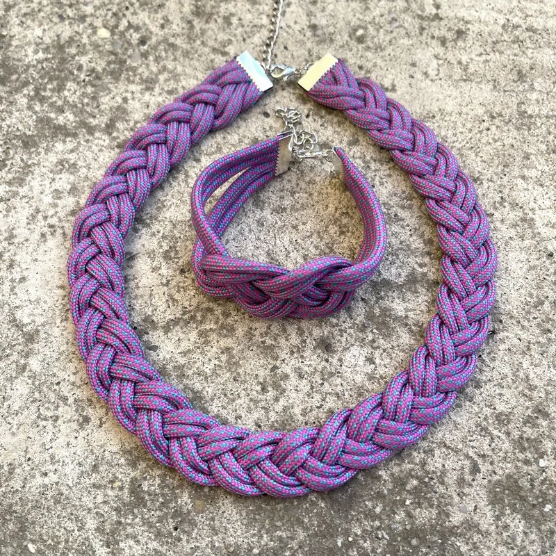 Egyedi, paracord zsinórból készült fonott nyakláncból és csomózott karkötőből álló ékszer szett.