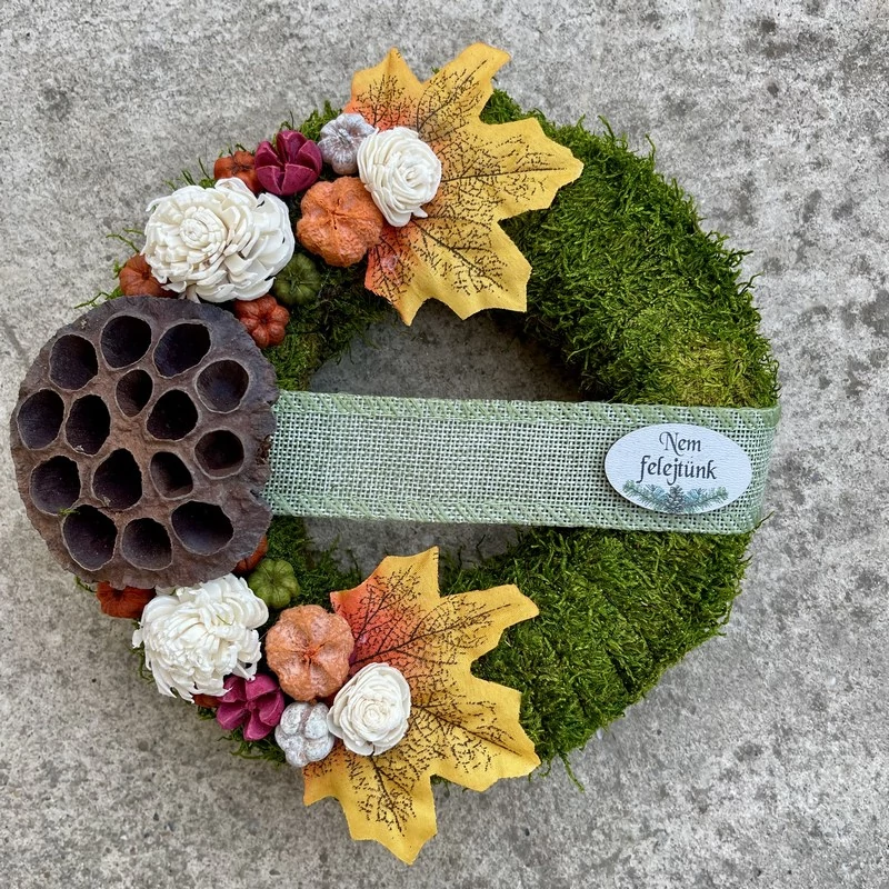 Mohás 20 cm-es koszorú sírdísz, Nem felejtünk táblával