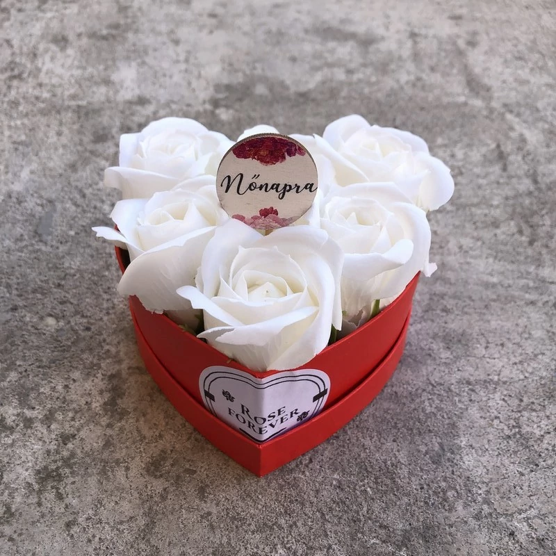 Nőnapi ajándék rózsabox - piros szív doboz, fehér szappanrózsákkal