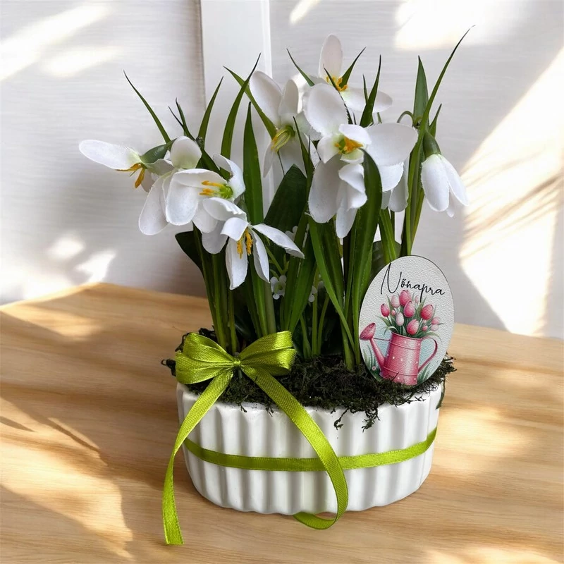 Nőnapi ajándék kaspós dekoráció, hóvirágokkal, 13x8 cm-es, ovális kerámia kaspóban