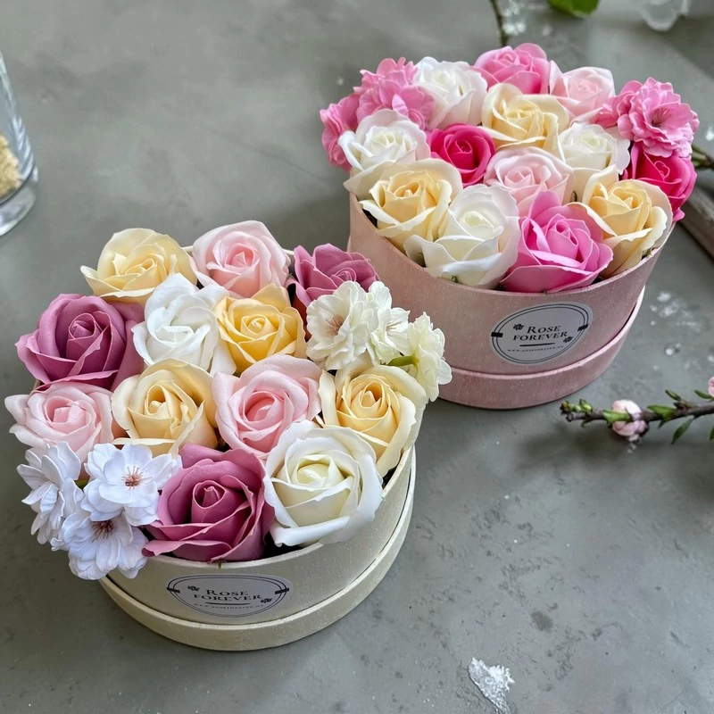 Exkluzív minőségű, a piacon újdonságnak számító, szappanrózsákkal, szappanhortenziával és szappanból készült cseresznyevirágokkal tűzdelt, saját készítésű rózsa box. Az új generációs "művirágok" megszólalásig hasonlítanak az igazira, de mégsem hervadnak el, így igazán tartós és dekoratív része lehet a megajándékozott otthonának!