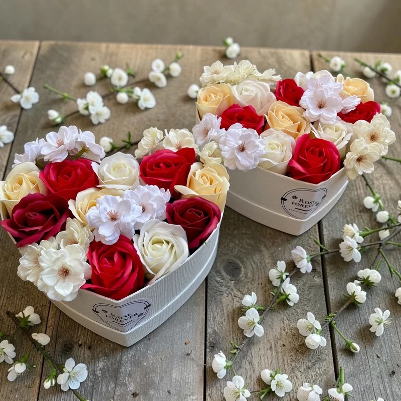 Exkluzív minőségű, a piacon újdonságnak számító, szappanrózsákkal, szappanhortenziával és szappanból készült cseresznyevirágokkal tűzdelt, saját készítésű rózsa box. Az új generációs "művirágok" megszólalásig hasonlítanak az igazira, de mégsem hervadnak el, így igazán tartós és dekoratív része lehet a megajándékozott otthonának!
